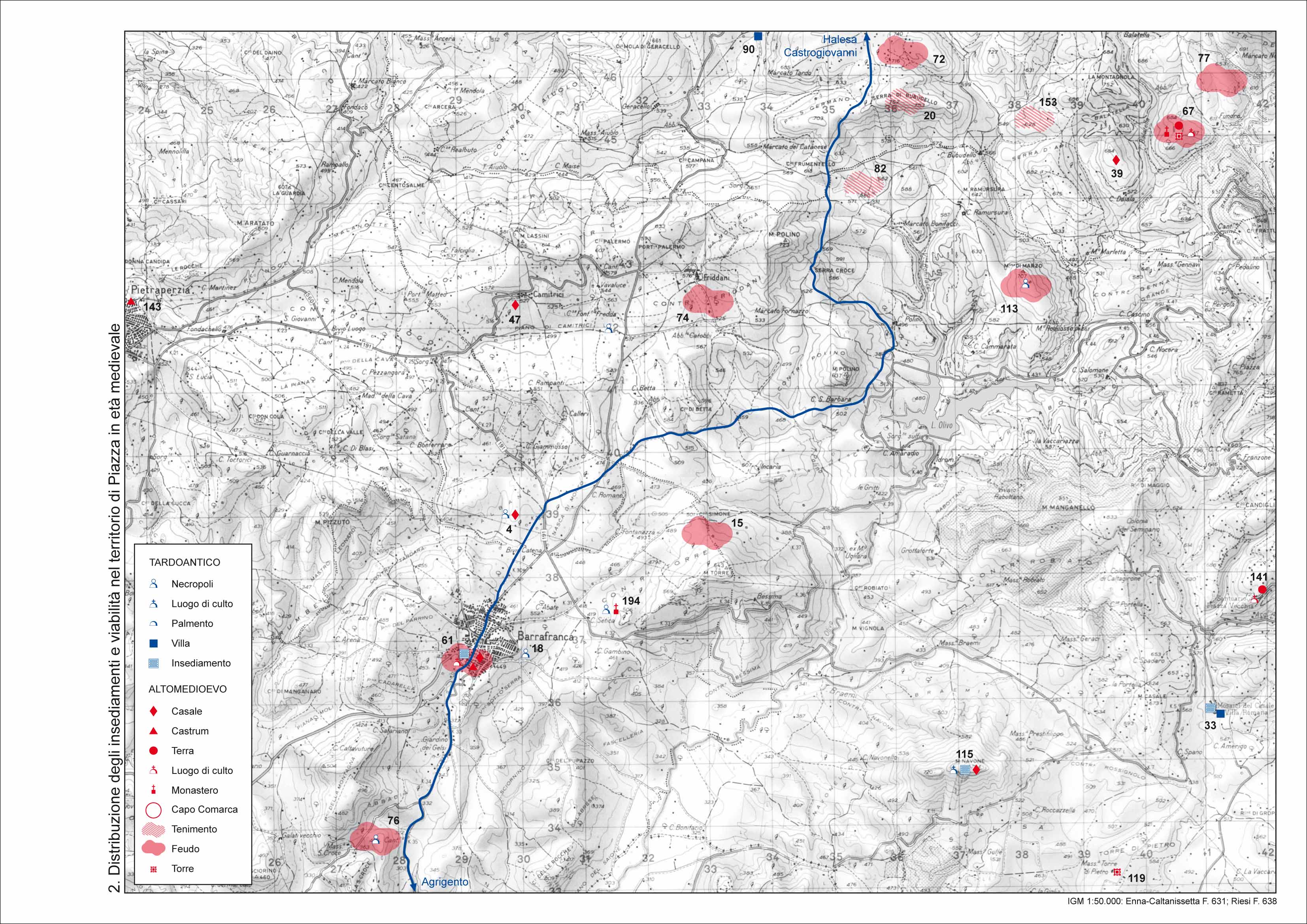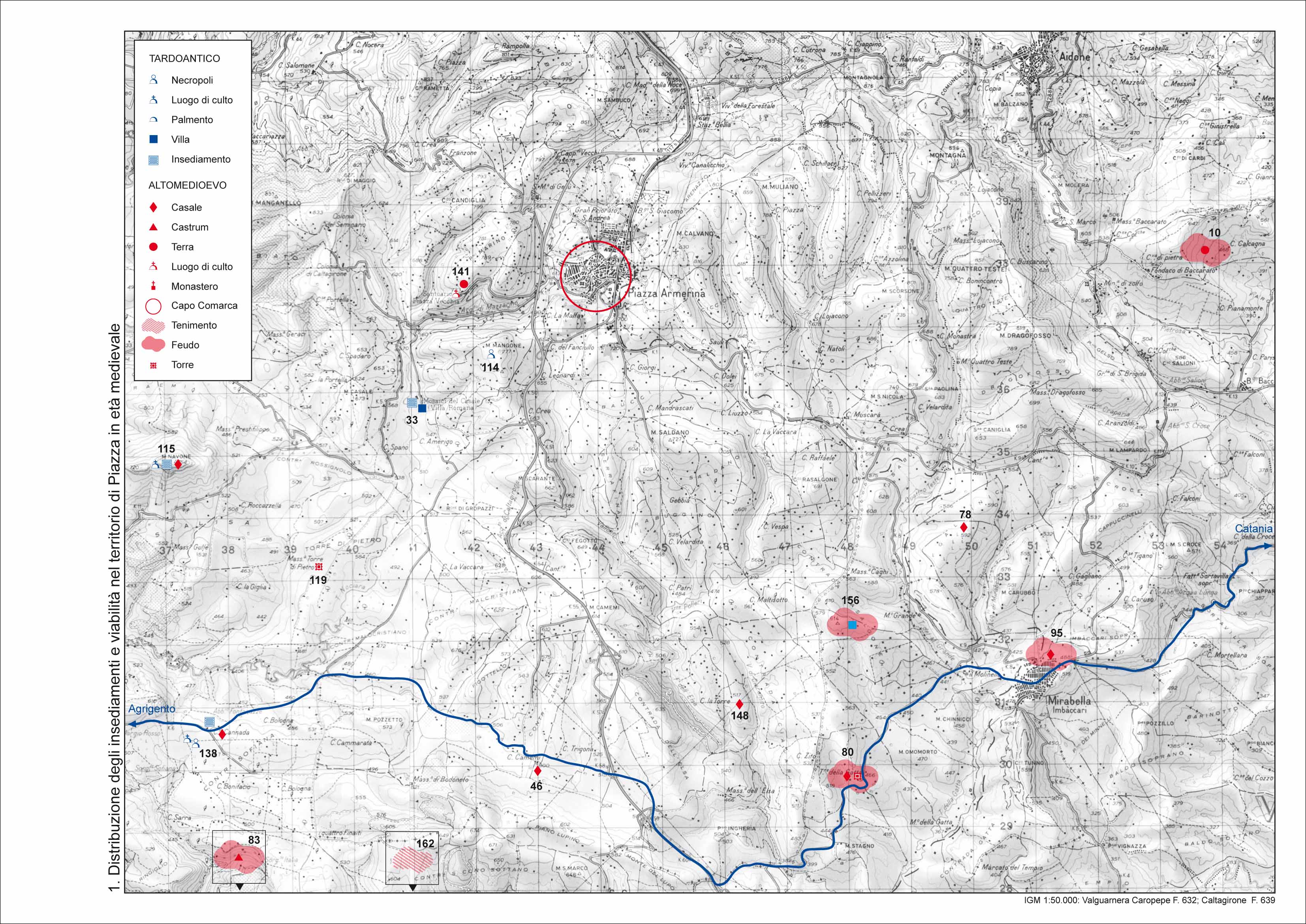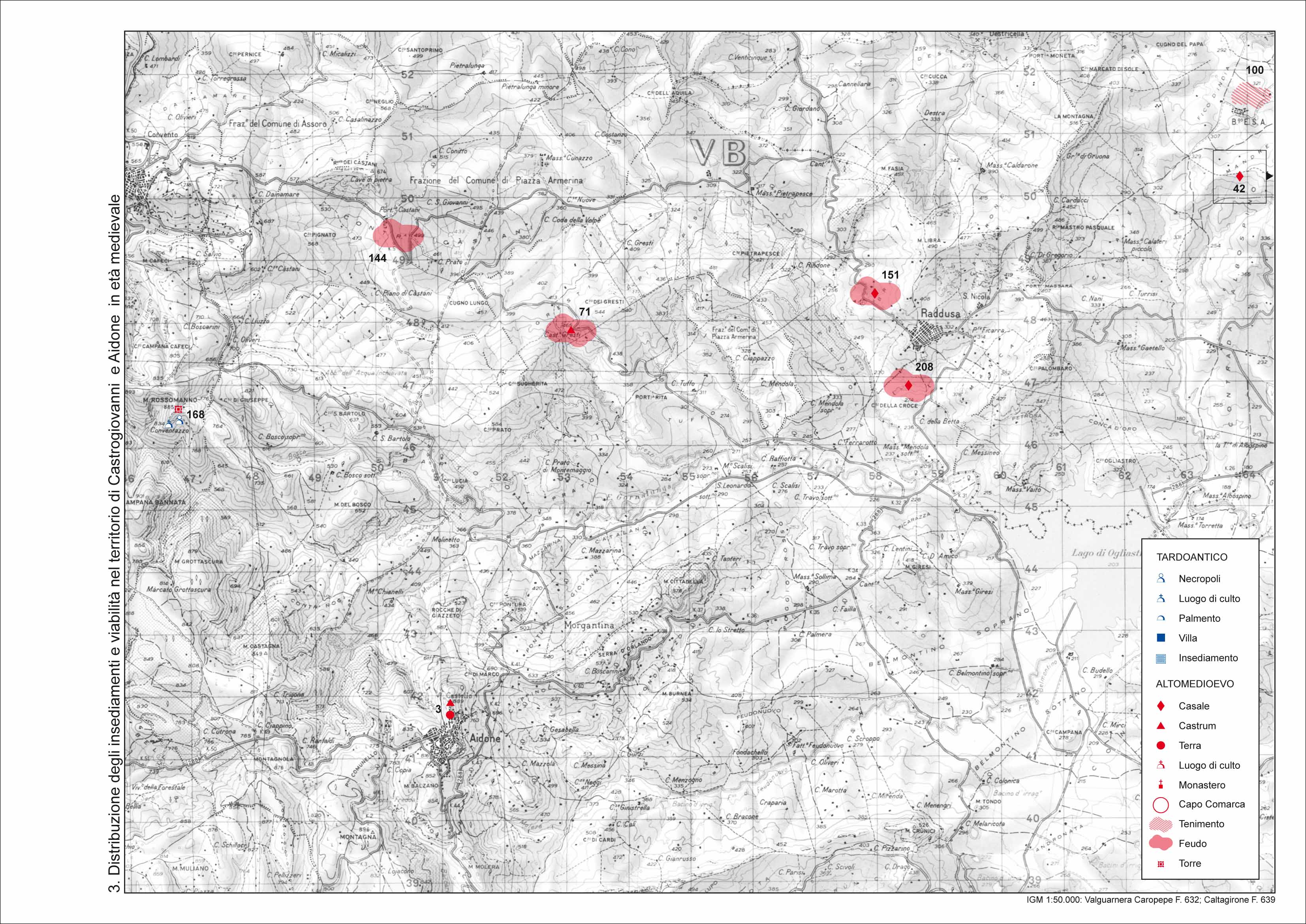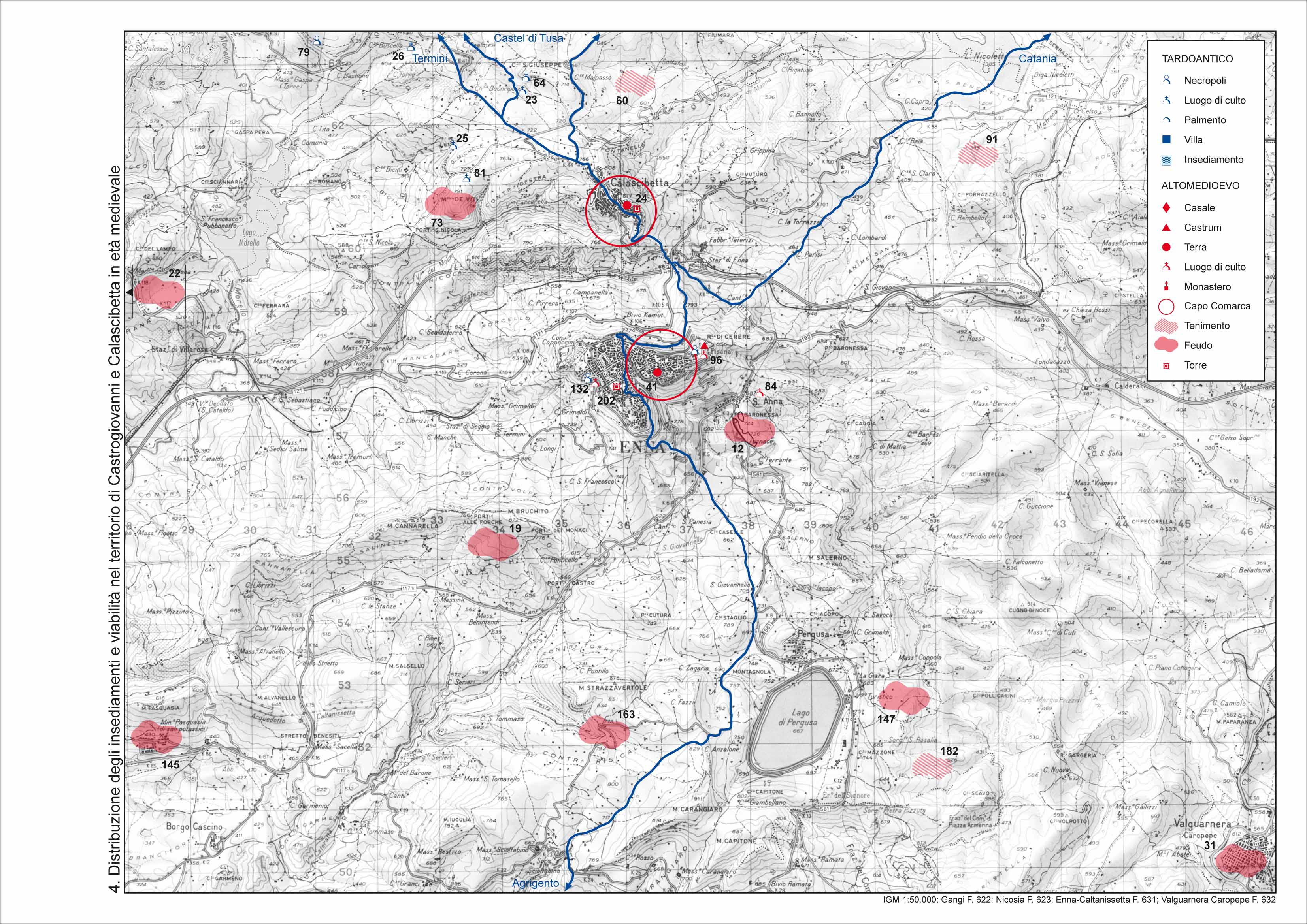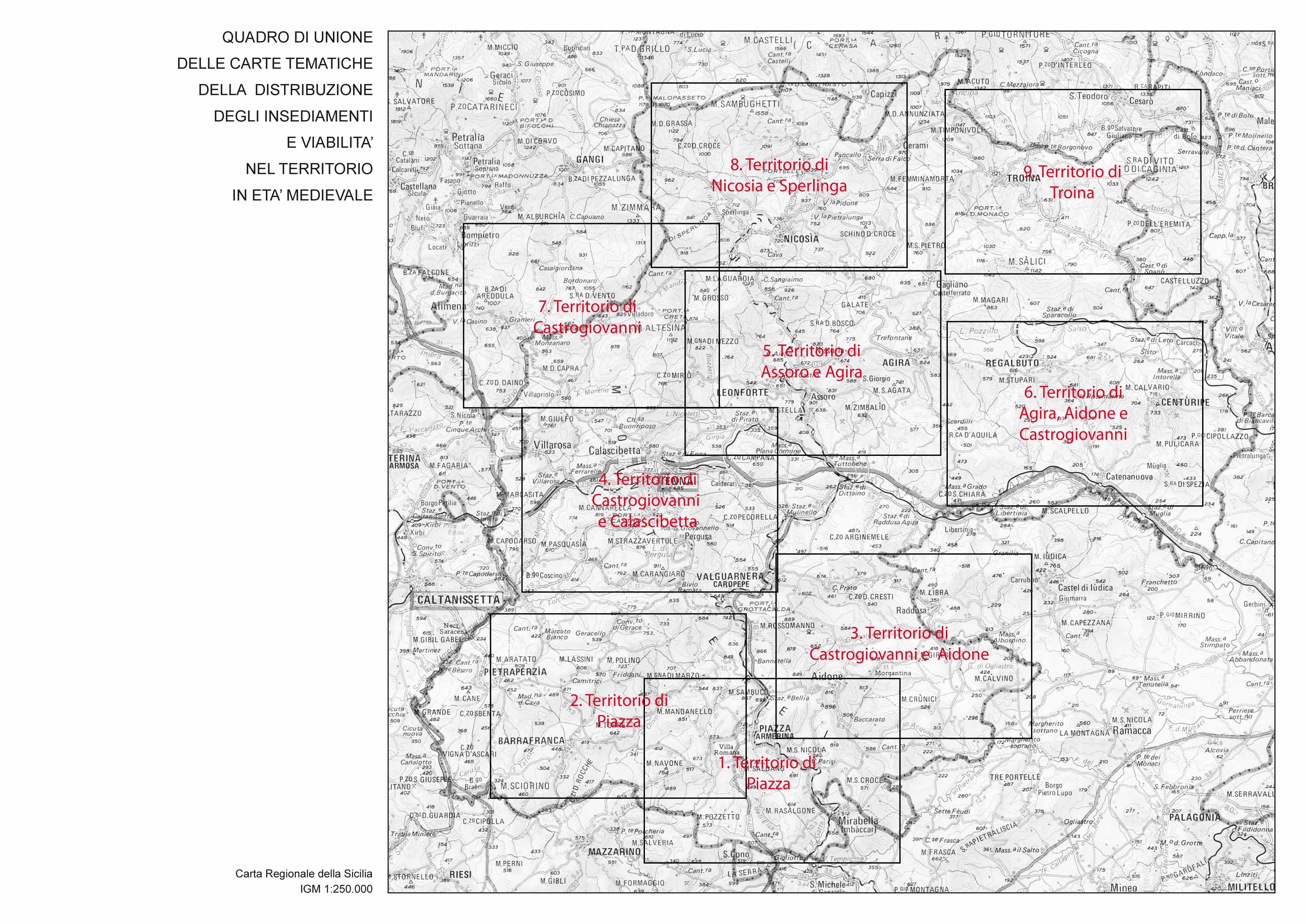 In particolare, ci si propone di verificare i possibili collegamenti tra la viabilita' e la distribuzione degli insediamenti, dei casali, dei castra e da ultimo, delle fondazioni monastiche basiliane al fine della ricostruzione di una geografia amministrativa del territorio, mediante un'indagine che non presuppone i limiti geografici e topografici della realta' da osservare, ma punta proprio a definirla attraverso la verifica della concreta proiezione nello spazio dei poteri radicati nel mondo urbano.