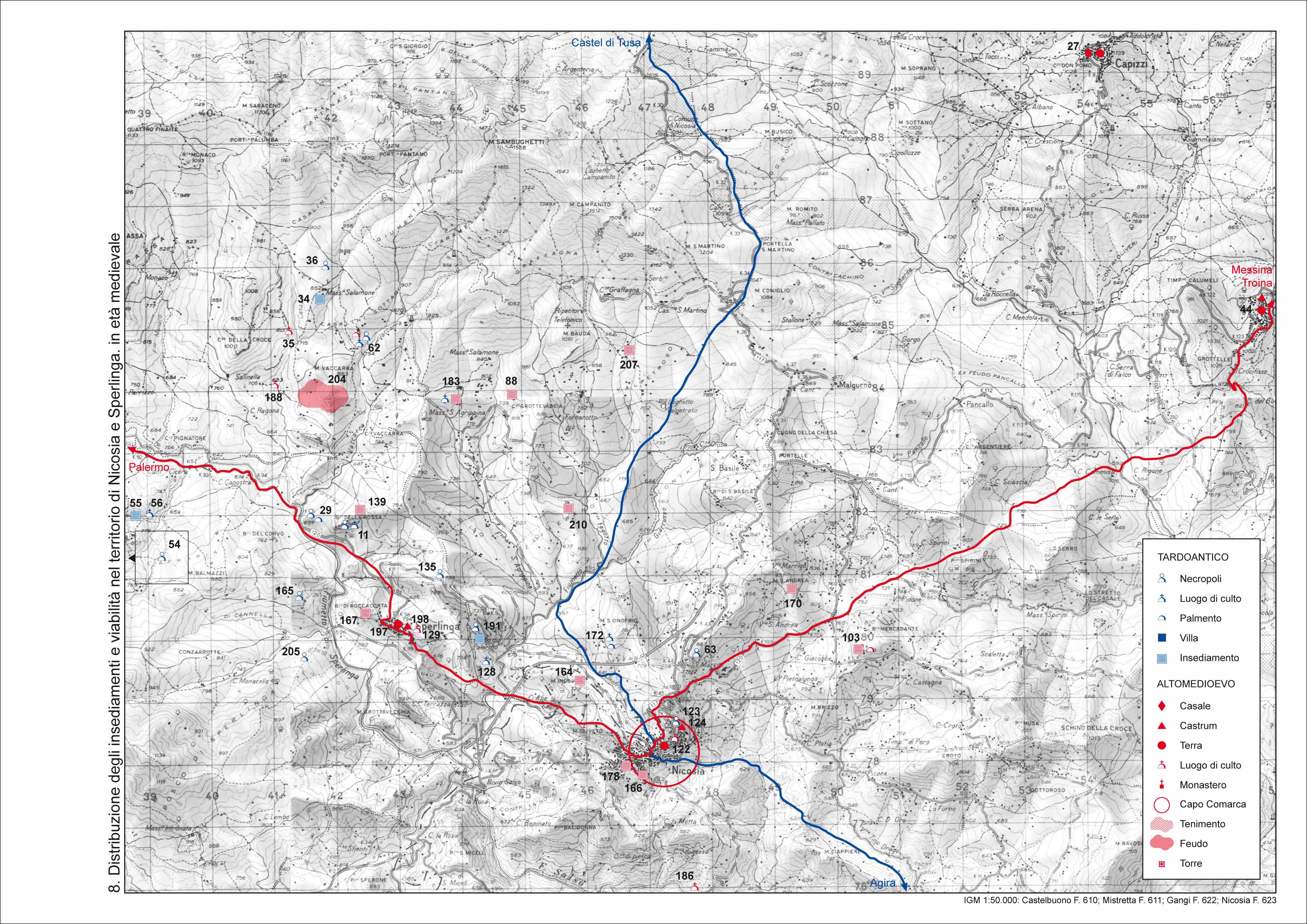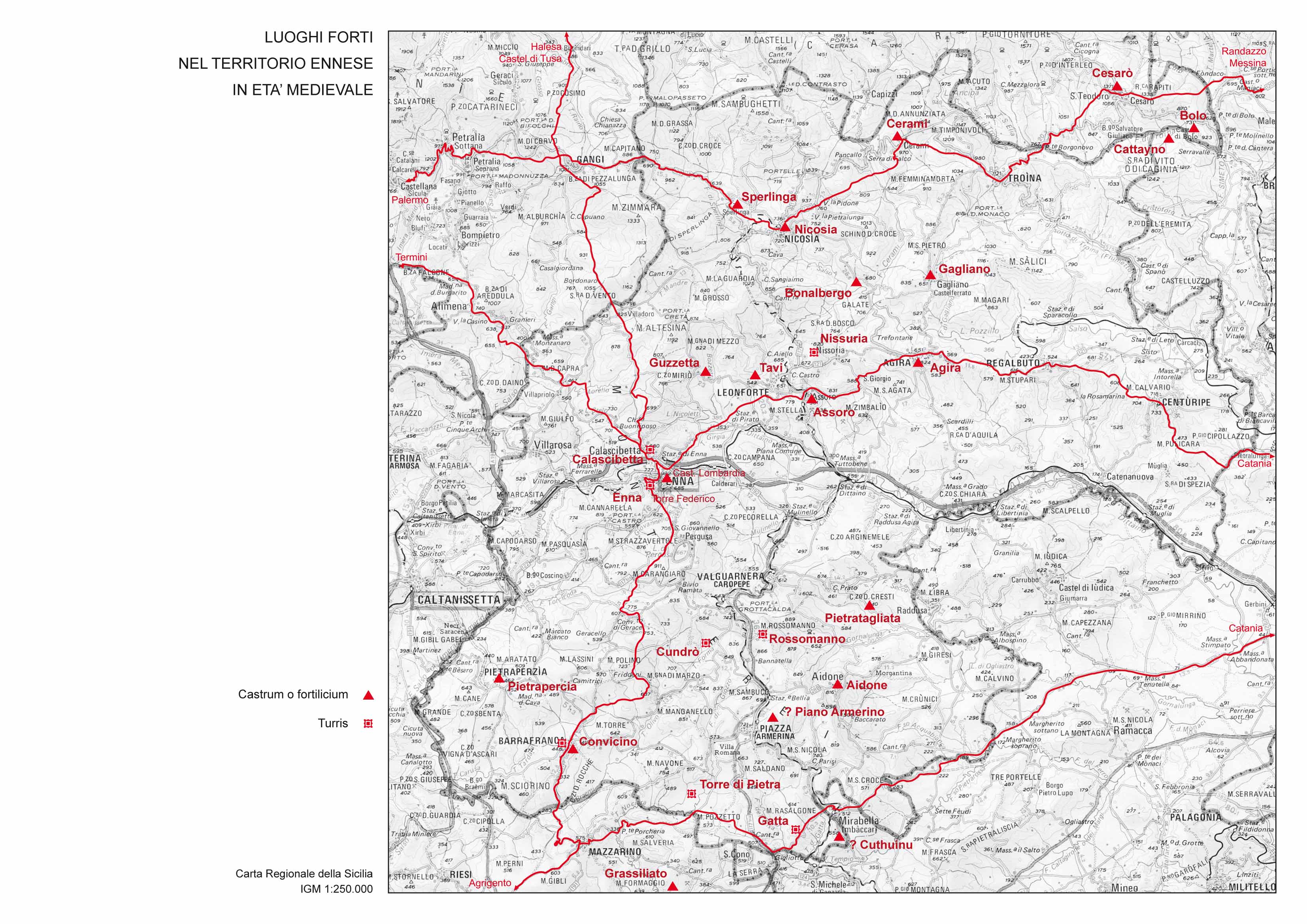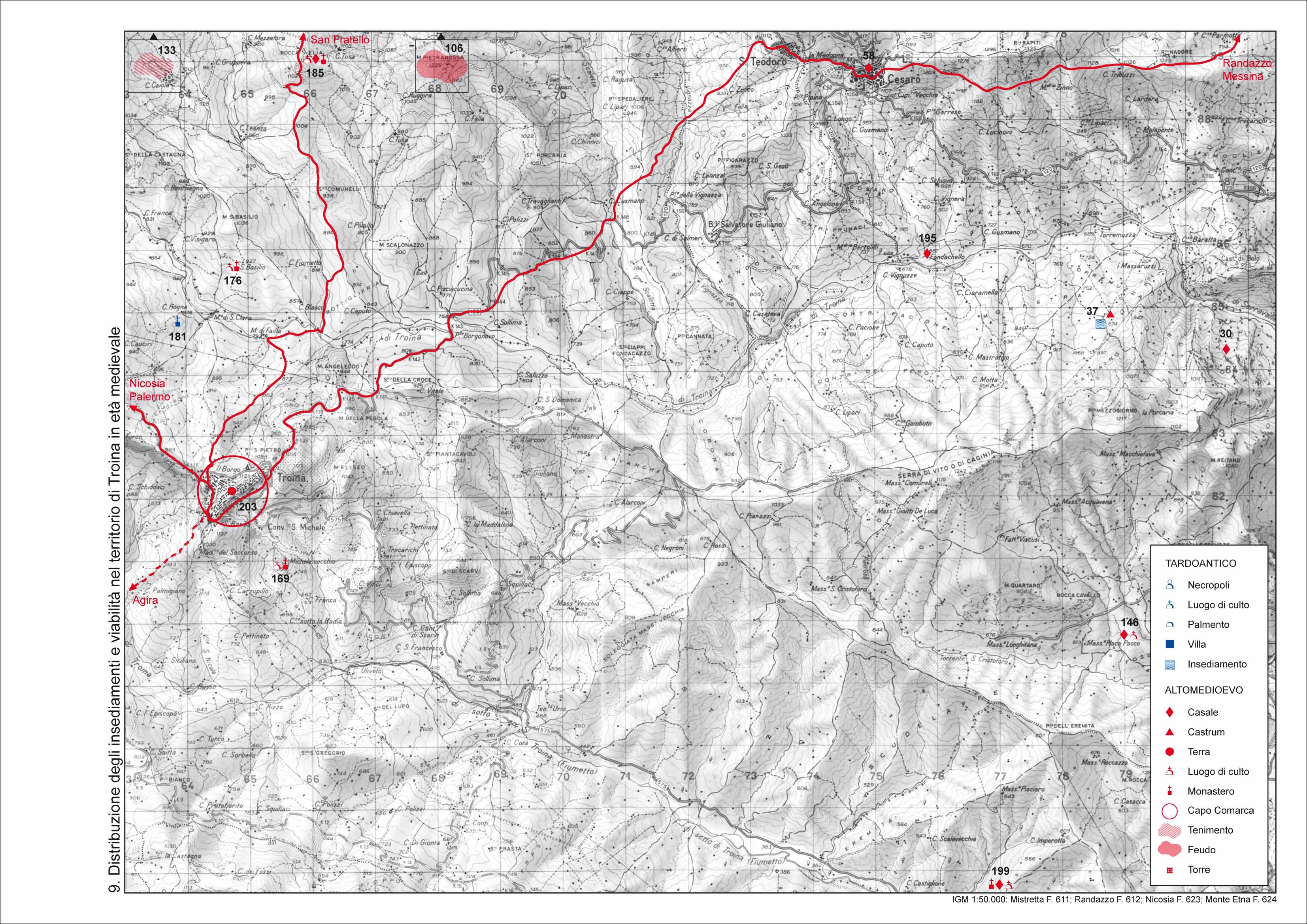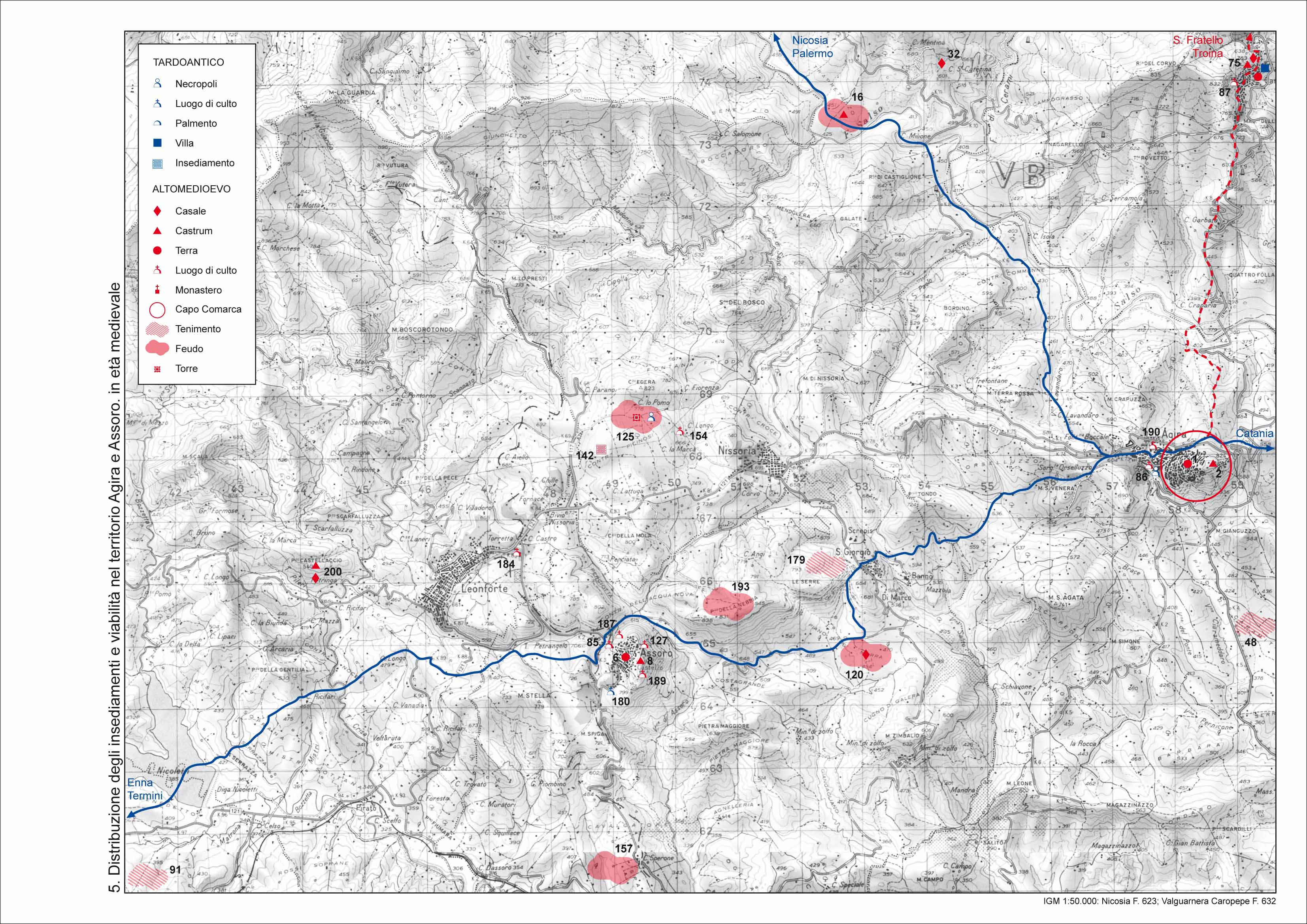 La zona oggetto dell'indagine era caratterizzata nella tarda antichita' da un popolamento rurale di tipo sparso; in particolare le ricognizioni nell'area nord della provincia hanno permesso di identificare diverse le necropoli rupestri che ci restituiscono il tessuto connettivo dell'insediamento di eta' tardoantica in questo territorio, probabilmente interessato dalla riorganizzazione militare promossa dall'autorita' di Bisanzio, in quanto immediatamente al confine con l'area dei Nebrodi, per la quale si assiste in eta' tematica ad una riorganizzazione dell'assetto viario, rispetto alla fase tardoromana, probabilmente legata alle esigenze militari di spostamento e vettogliamento delle truppe. Il comprensorio dei Nebrodi gia' rivitalizzato in eta' bizantina assumera grande rilievo durante l'eta' normanna grazie alla fondazione di alcuni monasteri nel territorio di Troina, prima sede di Diocesi e vero e proprio "laboratorio" della politica religiosa promossa dai sovrani normanni all'indomani della conquista dell'isola.